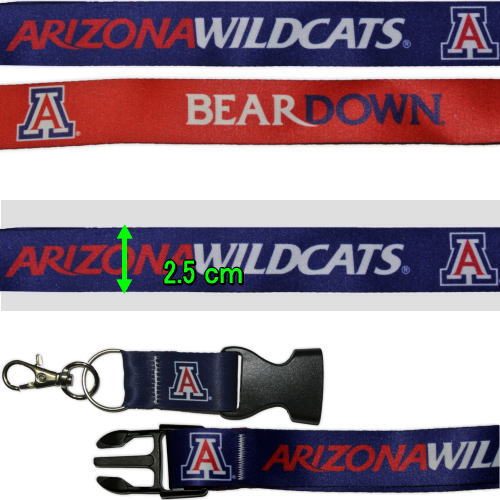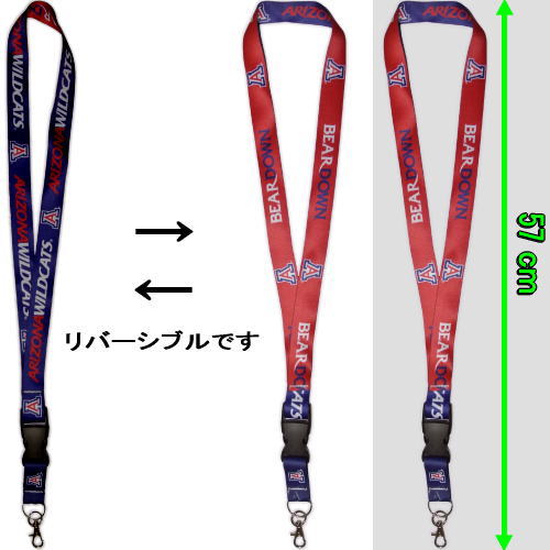 | 備考 | ワインレッド&ネイビーの2トーンカラーネックストラップです。 各色がメインとなるリバーシブルの仕様で、光沢のある化繊の本体に、文字やロゴが染めつけられています。 ネイビーの側に、大学名とチーム名、マスコットロゴが、ワインレッドの側にチームロゴとスローガンの Bear down が入れられています。 先端は着脱可能です。 |