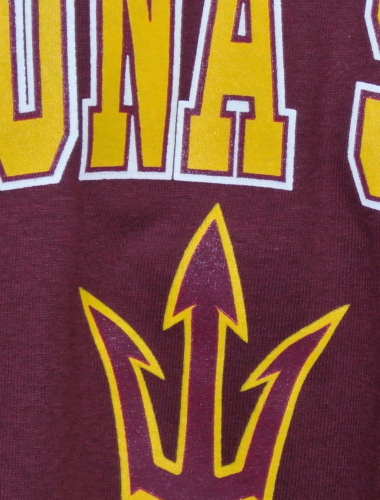 | 備考 | ジェームズ・ハーデン選手、エディー・ハウス選手、バイロン・スコット選手の出身校、アリゾナ州立大サンデビルズのTシャツです。 大学名と、マスコットのスパーキーが持っているスピアー(槍)がプリントされています。 文字はホワイトで縁取りされています。 プリントはフロントのみです。 公式カラーはマロンとゴールドですが、生地はマロンよりも、やや赤紫がかっております。 |