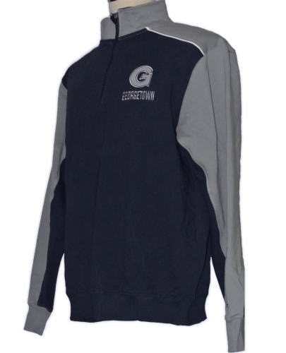 | 備考 | グレー × ネイビー × ホワイトのウォームアップウェアです。 胸元までチャックを下げて着脱する、かぶり物のつくりです。腹部にポケットはございません。 裏地は、起毛した生地となっており、保温性が高まっています。 フロントのロゴ、背面のマスコットはパッチワーク(一部が刺繍)、Georgetown の文字は刺繍です。 |