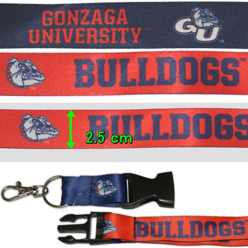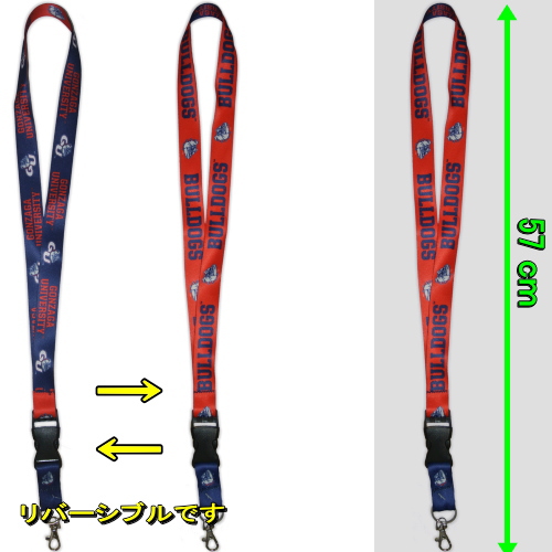 | 備考 | ゴンザガ大のチームカラー、レッド&ネイビーのネックストラップです。 各色がメインとなるリバーシブルの仕様で、光沢のある化繊の本体に、文字やロゴが染めつけられています。 ネイビーの側に、大学名とチームロゴが、レッドの側にチーム名とマスコットロゴが入れられています。 先端は着脱可能です。 |