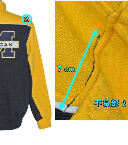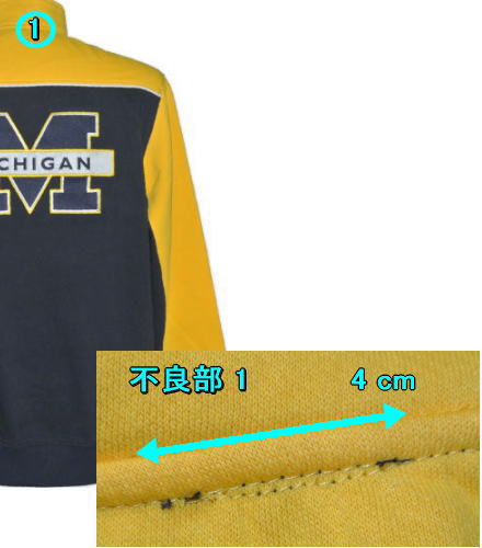 | 備考 | フロントとバック、袖の内側がネイビー、上部がメイズ(イエロー)の2トーン・ウォームアップウェアです。 向かって右胸にMロゴと大学名が刺繍され、背面にはチームロゴがパッチワークで縫いつけられています。 生地表面はスウェットやトレーナーのような造り、内側は起毛の仕様となっており、保温性に優れております。 フロントのチャックが胸元まで開く、かぶりものの造りです。 こちらの品質について 9番目・10番目の画像をご覧下さい。2箇所、難点がございます。 いずれも強度には問題はございませんが、下記の品質のため値引きにて販売しております。 ご注文の際は、こちらの品質をご了承の上、お求め下さいますようお願い致します。 1.襟の縫いつけが二重になっており、ネイビーの糸を部分的に巻き込んでしまっております(4cm)。 2.そでの付け根が、ネイビーの糸で1本余計に縫い付けられております(7cm)。 |