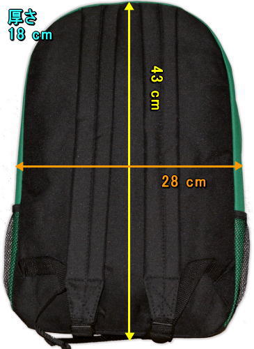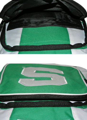 | 備考 | ミシガン州立大学のバックパックです。 本体はポリエステル生地、Sロゴはパッチワークの縫いつけ、大学名は刺繍です。 バッグ上部には、取っ手がついています。 正面に 27 × 23 cm のポケットがあり、内部には、ペンや小物を収納できるようになっております。 また、左右には 12 × 13 cm のネット仕様のポケットがあります。 |