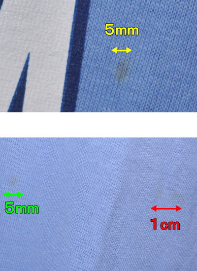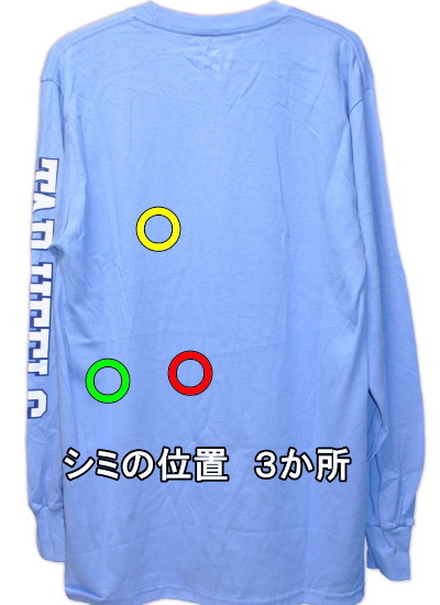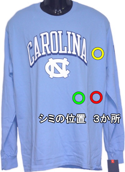 | 備考 | ノースカロライナ大チームカラーのロングスリーブTシャツです。 フロントに、大学名「CAROLINA」とNCロゴが、向かって右袖にチーム名「TAR HEELS」がプリントで入れられております。 いずれの文字も縁取り・影が施されております。 こちらの品質について 5〜8番目の画像をご覧ください。 フロントと裏、それぞれにオレンジ色の濃淡のシミが複数ございます。詳細は下記をご参照ください。 この品質のため、値引き処分としております。お求めの際は、こちらの品質をご了承の上、ご注文くださいますようお願いいたします。 フロント3箇所 黄色い丸(Aの文字近く):5ミリ、みどりの丸:5ミリ、赤の丸:5ミリ(左)と1センチ(右) うら 黄色い丸:5ミリ、みどりの丸:5ミリ、赤の丸:5ミリ(左)と1センチ(右) |