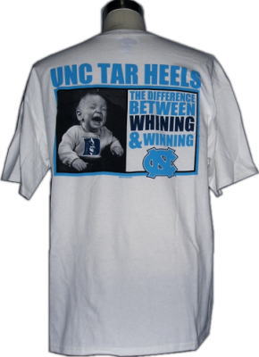 | 備考 | 大学限定商品の1つです。 背面に書かれているメッセージを意訳しますと、 『つづりは似ているけど、勝利:Winningと、グチを言って嘆く:Whiningのとの違いだよ』 になり、子供の衣服にはDUKE大のロゴが入っております。 つまり、嘆くのはDUKE大(とDUKE大を応援している人)で、勝利するのはオレ達ノースカロライナ大だ、という強烈なユーモアを描写したTシャツです。 こちらの商品もですが、こうした堂々と露骨な表現が描写されているのは、大学や地元限定商品の特徴ですが、この2校のように近隣大学同士ならではです(同じカンファレンスでも遠方に所在するライバルを、商品を通じて批判するのはフェアではないためです)。 |