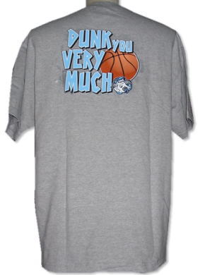 | 備考 | 大学限定商品の1つです。 フロントには「UNC BASKETBALL」のプリント、背面には「Thank you very much」にかけて「Dunk you very much」の文字と、バスケットボール、コミック調のマスコット(羊)がプリントされております。 また、文字プリントの周囲にシミのような物が見えますが、これは文字にかけられた銀色の影で、ラバープリントによる模様です。 |