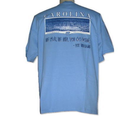 | 備考 | 大学限定商品の1つです。 フロントには、ワンポイントのNCのロゴ、背面にはディーン・スミスセンターでの試合の写真と、現ヘッドコーチのロイ・ウィリアムス監督の言葉「We play, We win, You go home (=我々がプレーし勝つ、だから君らはお家に帰りなさい)」とがプリントされております。 |