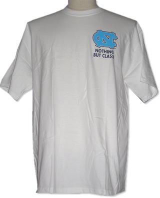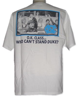 | 備考 | 大学限定商品の1つです。 フロントには、ワンポイントのNCのロゴ、背面には「O.K. Class...Who can't stand DUKE?(= DUKE大学に味方できないのは誰?)」という問いかけに、子供達がさわやかな表情をして一斉に挙手しているという状況で、DUKE大学へのキツい悪態を表現しています。 |