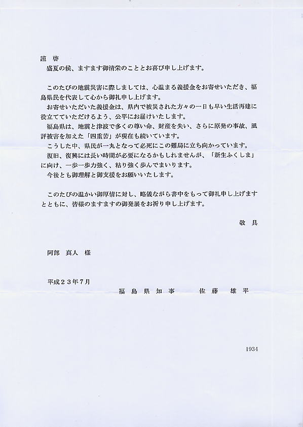 これを受け、去る7月22日付けで、この募金が受領されたことを、同県県知事・佐藤 雄平様のお名前で受領書ならびにお礼状をいただきましたことをもちまして、当サイトお客様へのご報告とさせていただきたく存じます。