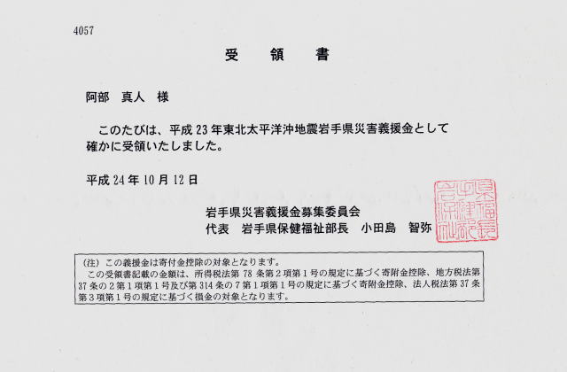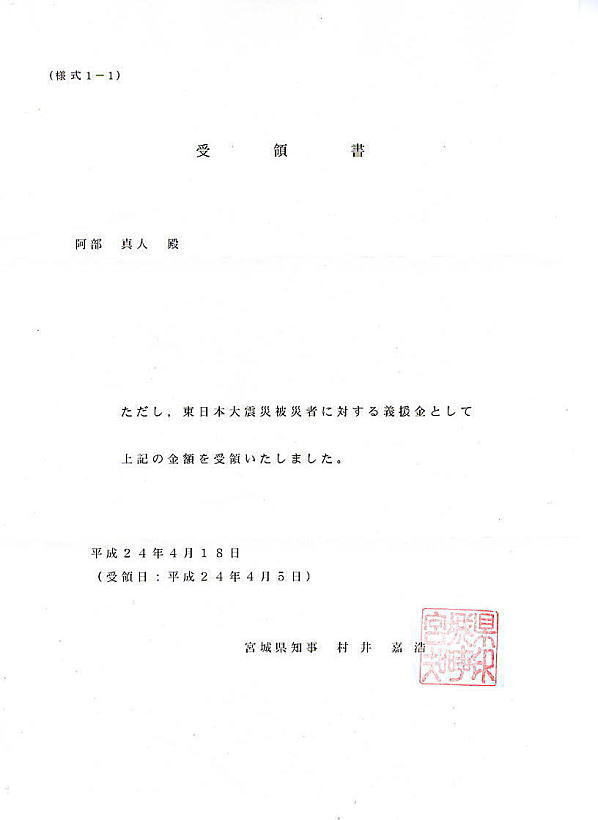 これを受け、去る2012年4月18日付けで、この募金が受領された旨を、同県県知事・村井 嘉浩様のお名前で受領書をいただきました。