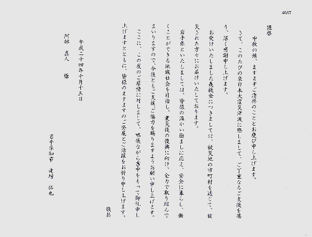 去る、2012年10月12日付けで、岩手県 災害義援金募集委員会様へ義援金を送金しましたことを、ご報告いたします。