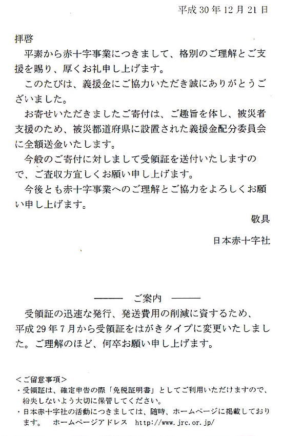 募金いたしました、日本赤十字社より同社社長 近衛忠輝様のお名前で受領書をいただきましたことを、ご報告いたします。