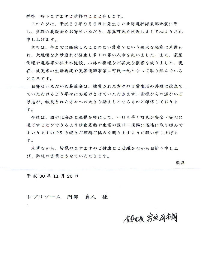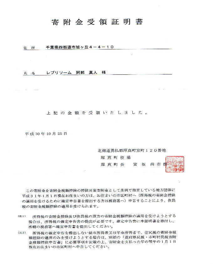 また上記を受け、厚真町長 宮坂尚市朗様のお名前で、受領書、感謝状をいただきましたこと、あわせてご報告いたします。
