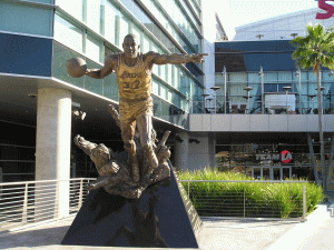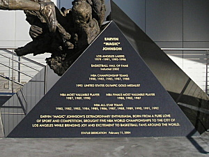 像の台座には、何年間レイカーズでプレーし、何回MVPを獲得したかなど、マジック・ジョンソン選手の華々しいキャリアが刻まれています。