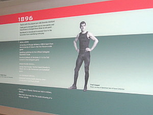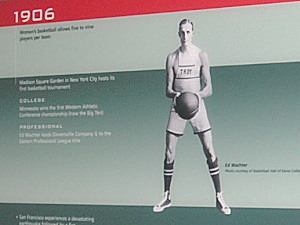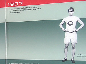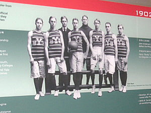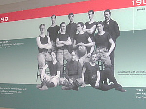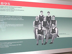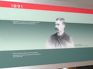 そして、もう1つこのフロアの縁に沿って存在しているのが、この年表です。ネイスミス博士が1891年にバスケットボールを考案したのをかわぎりに、現代までの歴史が記述されています。