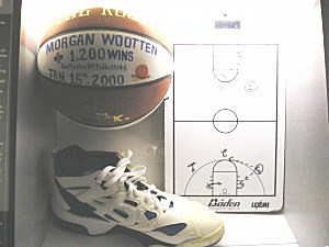 - モーゼス・マローン選手のシューズと、DUKE大学のマイク・シャシェフスキー監督のサインが入った2001年優勝記念品、1994年3月7日にテンプル大のジョン・チェイニー監督がジョージ・ワシントン大学を54-34で破り、500勝目をあげた記念ボールです。