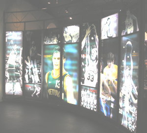 - こちらは見るだけなのですが、とても高いゴールの下にハーレム・グローブトロッターズの選手の等身大の立て看板があります。