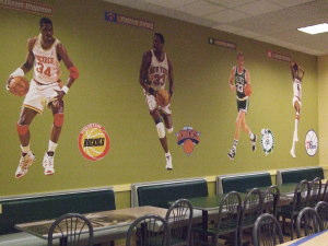 アキーム・オラジュワン選手、パトリック・ユーイング選手、ラリー・バード選手、Dr.Jことジュリアス・アービング選手が壁にプリントされています。
