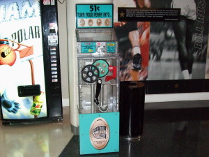 の通り、25セント硬貨を2枚(50¢)入れ、4つのデザインのうちいずれかを選んで、機械中央のハンドルを回すと、1¢と同じ材質の記念コインが出てくる、というものです。俗に言う、ペニークラッシャー、ペニープレスと呼ばれているものだと思われます。※