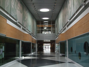 ホールの様子も当時のままで、頭上にはバスケットボールの試合の様子が大きなパネルとなって、ホール上方両側を飾っています。