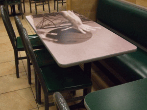 店内のテーブルは、グリーンのモノトーンの物以外に、画像の通りバスケットボールあるいはボールとリングがプリントされた大小のテーブルがあります。