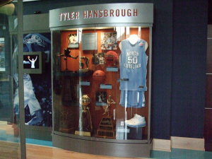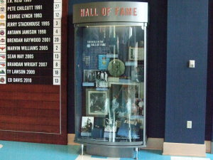 こちらは、ドラフトボードの足下にあるショーケースです。中には、この大学出身でNBAで活躍する・した選手のジャージ数着とシューズが一足収納されています。