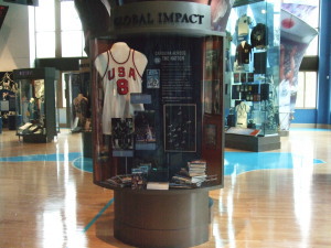 この大学の物の他に、NBAでのメモラビリア(ブルズのウォームアップジャケット、NBAオールスターMVPトロフィー)と、ドリームチームのジャージも飾られています。
