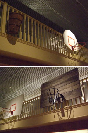 最初は、桃の収穫カゴだったゴールは、シュートが決まったらボールがそのまま落ちてくるように、底に穴が開けられ、のちに金属のHOOPに置き換えられ、更にその背後にはボードが付けられました。