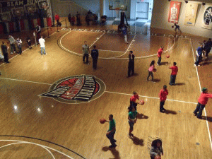- 壁には、NBA選手達の姿を捉えたバナーやパネルが飾られ、クリニックコート脇には、ジャムセッションさながらの、高さの異なるゴールが設置され、ダンクを楽しむ子供達であふれかえっています。