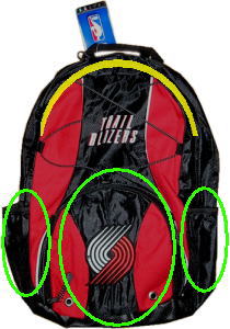 イエローの線の箇所がメインの収納、それとは別に、フロントには3箇所(グリーンの線)の収納部があります。左右はポケット、中央はチャックのついたポケットになります。