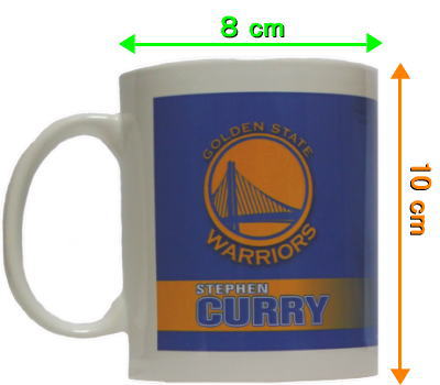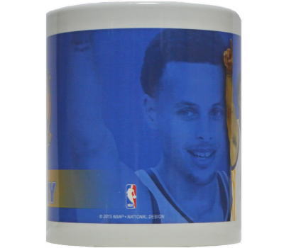 ホワイトのマグカップに、チームロゴ、カリー選手の姿、名前、シルエットで顔がプリントされております。