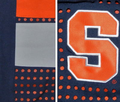 × グレーの3種類の生地が縫い合わされてできております。全体的に光沢・テカりが多いように見えますが、5枚目のパッチワーク等の画像のように、若干くすんだダークネイビーに、細かな光沢のある生地になります。 サイドに大きなメッシュ穴があり、軽量化されたポリエステル生地に、パッチワーク製のチームロゴが縫い付けられております。 ウェストには、調節用のヒモがあります。 |