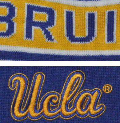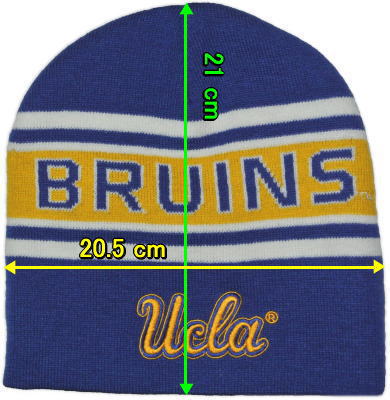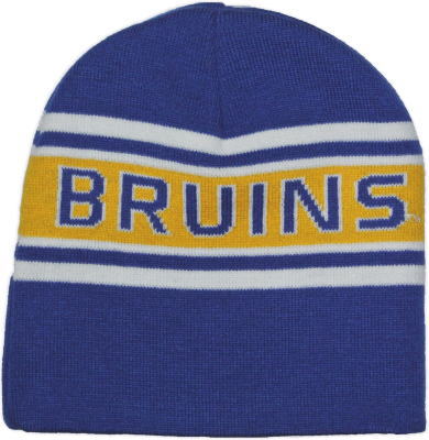 チームカラーであるブルーの本体中に、ホワイトのストライプ、チーム名 Bruins が前後に編みこまれ、額の箇所に大学名が刺繍されております。