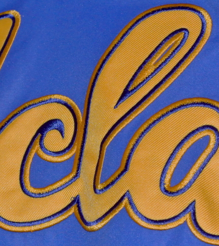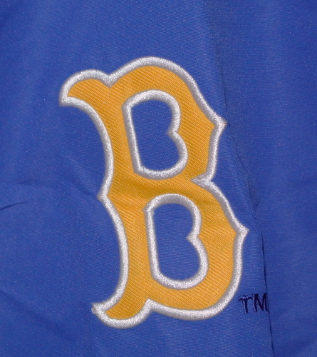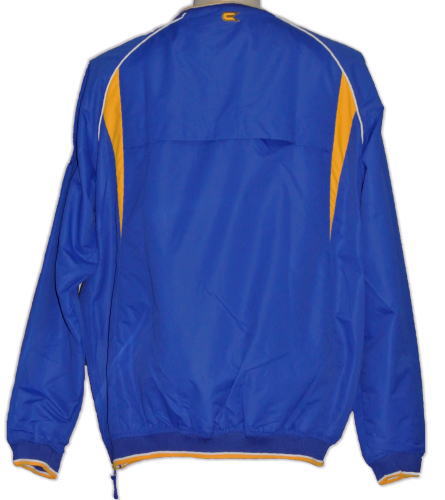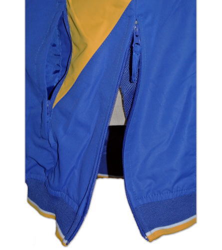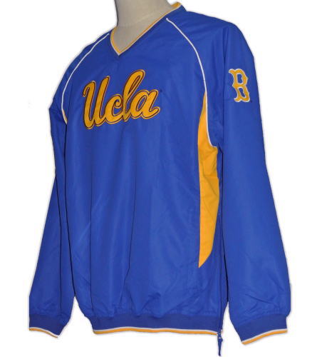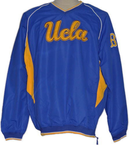 | 備考 | チームカラーのブルー×イエロー×ホワイトのUCLA(カリフォルニア大LA校)のウォームアップウェアです。 生地は、光沢の少ないポリエステル製で、裏地に汗をかいた際に生地が密着しないようにするためのメッシュ生地が採用されており、厚手のウィンドブレーカーのような造りとなっております(生地の光沢の具合は、画像 3〜5をご参考にして下さい)。 UCLAの文字、向かって右袖のBはパッチワークの縫いつけです。 背面にはマジックテープ式のエアダクト、腹部の左右にチャック式のポケット、向かって右側の裾には着脱がしやすいようにチャックがあります。 |