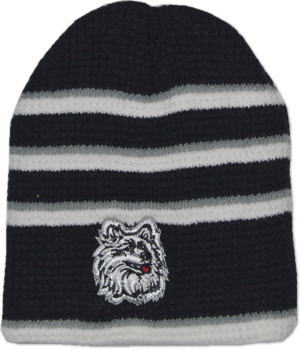 キッズサイズのビニースタイプニットキャップです。フロントのロゴは刺繍、カラーリングは、ブラックに近いダークネイビーです。