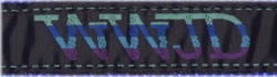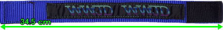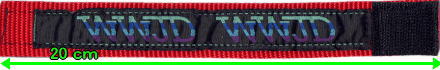 メインの生地(レッドまたはブルー)に、W.W.J.D.と刺繍されたブラックの生地が縫い付けられております。色ごとに長さが異なります(下記参照)。